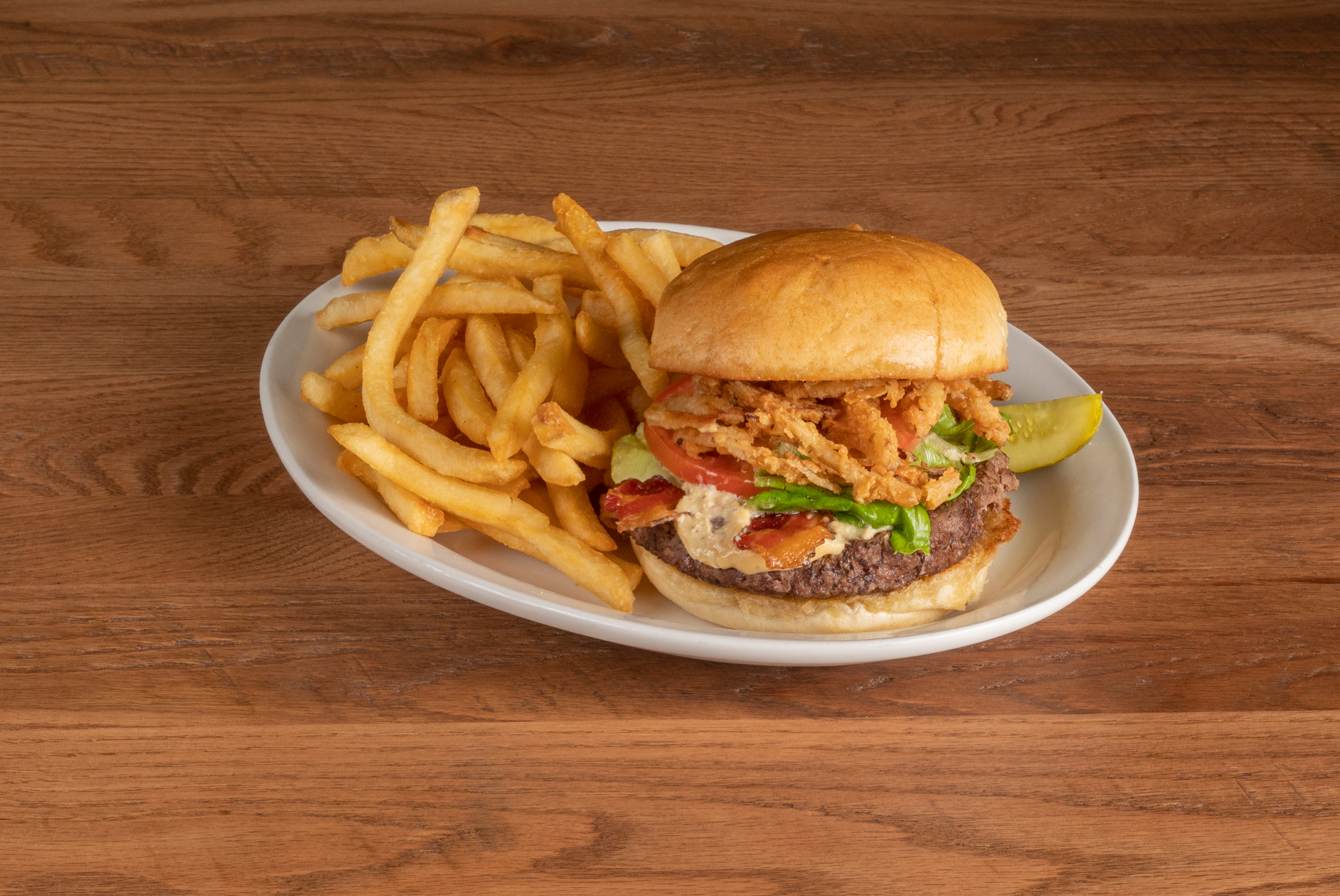Our angus beef patty topped with crispy bacon, crispy fried onions and smothered with queso.